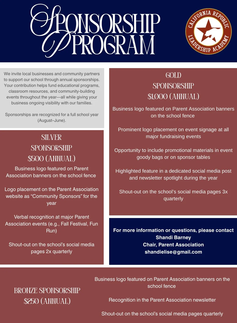 The purpose of the CRLA Capistrano Parent Association is to foster strong partnerships among parents, educators, and the school community in order to enhance student learning, promote family involvement, and support the success and well-being of all students